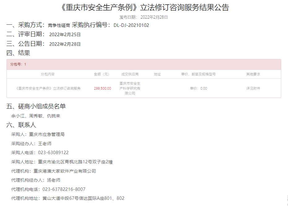 2月28日,“《重慶市安全生產(chǎn)條例》立法修訂咨詢服務(wù)”項目投標(biāo)結(jié)果在“行采家”網(wǎng)上進(jìn)行了公示,公司為中標(biāo)人。到目前為止,公示期結(jié)束,正式確定公司中標(biāo)該項目。