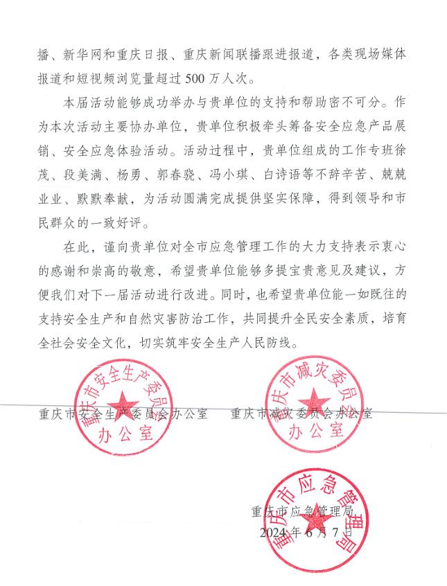 近日,全國“安全生產(chǎn)月”啟動儀式(重慶連線)暨重慶首屆“5·31”全民安全開放日活動圓滿舉辦。重慶市安委辦、重慶市減災(zāi)委辦、重慶市應(yīng)急局向我司發(fā)來感謝信,感謝公司作為主要協(xié)辦單位,為此項活動開展做出的努力和貢獻。