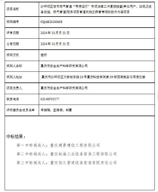 沙坪壩區(qū)城市燃?xì)夤艿馈皫Р∵\(yùn)行”專項(xiàng)治理工作復(fù)核抽查(單位用戶、站場(chǎng)及設(shè)備設(shè)施、燃?xì)夤艿?服務(wù)項(xiàng)目管道坑檢及探管等相關(guān)技術(shù)內(nèi)容項(xiàng)目招標(biāo)結(jié)果公告