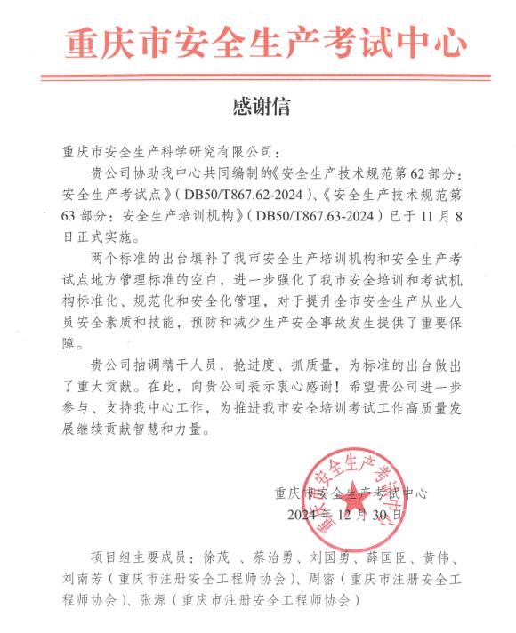 近日,重慶市安全生產(chǎn)考試中心給我公司發(fā)來感謝信,對公司在編制《重慶市安全生產(chǎn)技術規(guī)范-安全生產(chǎn)考試點》《重慶市安全生產(chǎn)技術規(guī)范-安全生產(chǎn)培訓機構》等兩部地方標準中所做的工作給予了充分肯定。