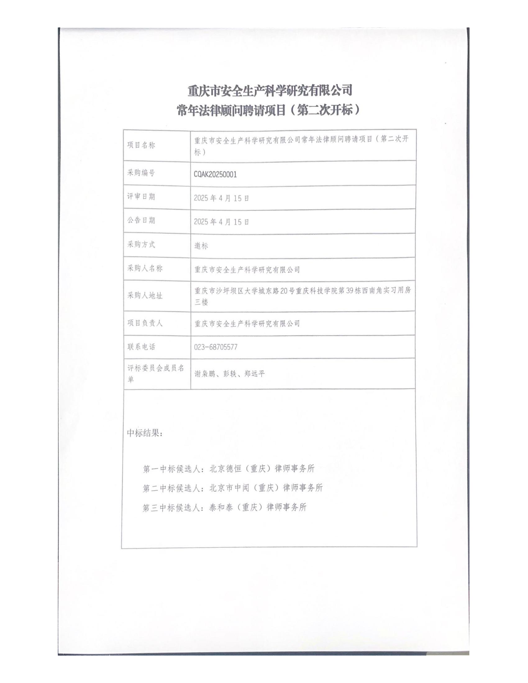 重慶市安全生產(chǎn)科學(xué)研究有限公司常年法律顧問聘請(qǐng)項(xiàng)目(第二次開標(biāo))