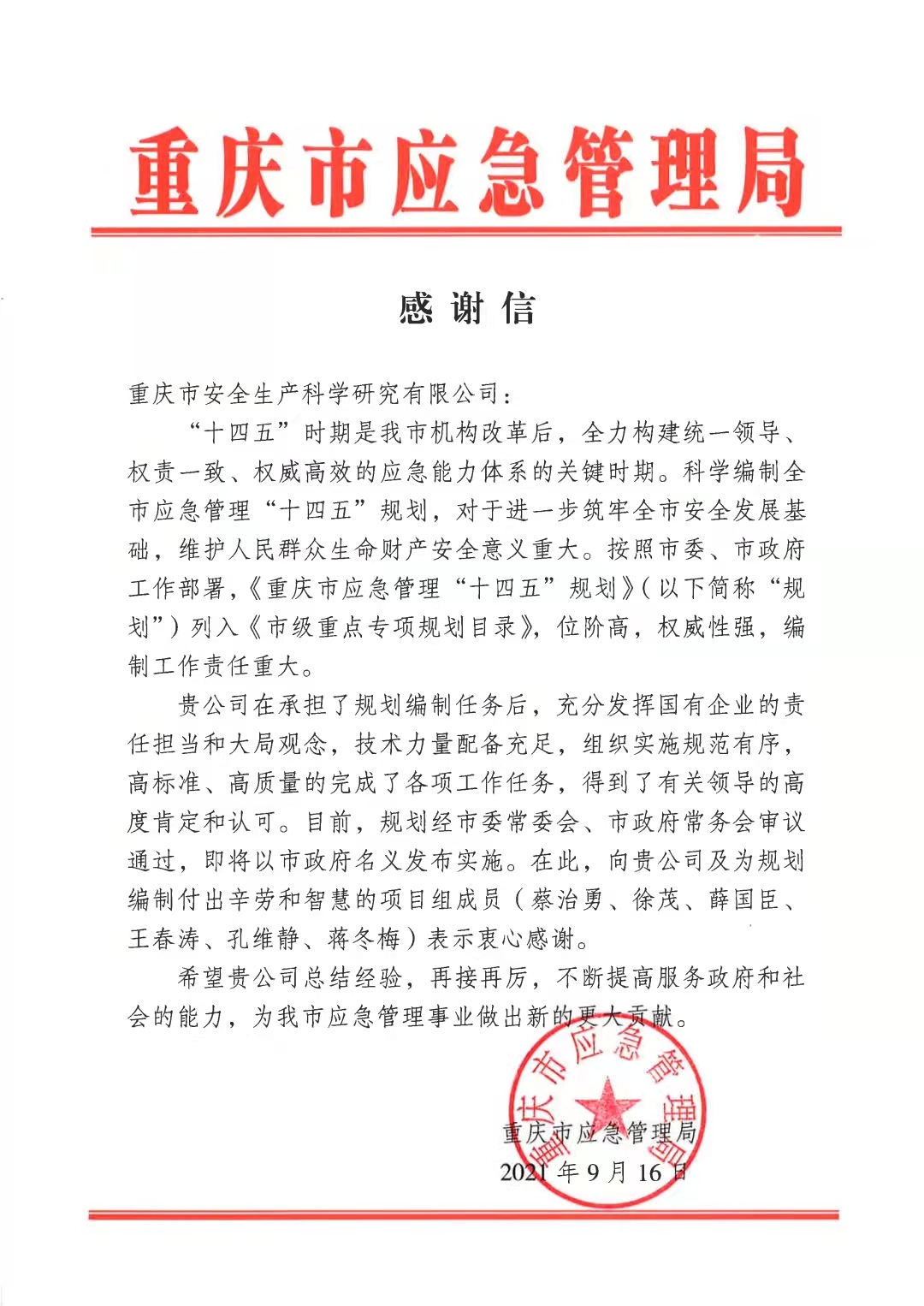 按照市委、市政府工作部署,市應(yīng)急管理規(guī)劃列入市級(jí)重點(diǎn)專項(xiàng)規(guī)劃目錄,位階高,權(quán)威性強(qiáng),編制工作責(zé)任重大。我公司承擔(dān)應(yīng)急管理規(guī)劃編制任務(wù)后,在市應(yīng)急管理局的領(lǐng)導(dǎo)下,集中優(yōu)勢(shì)力量,全力組織項(xiàng)目開展實(shí)施。廣泛收集各類文件材料、課題研究成果共計(jì)80余份,200余萬(wàn)字,深刻領(lǐng)會(huì)習(xí)近平總書記關(guān)于應(yīng)急管理工作的重要論述及對(duì)重慶的系列重要指示要求,全面總結(jié)“十三五”時(shí)期我市安全生產(chǎn)和防災(zāi)減災(zāi)工作成績(jī)和面臨挑戰(zhàn),研究謀劃“十四五”時(shí)期我市應(yīng)管理工作總體目標(biāo)、主要任務(wù)和重點(diǎn)工程項(xiàng)目。堅(jiān)持開門編規(guī)劃,深入開展調(diào)研,先后召開五次片區(qū)座談會(huì),向42個(gè)區(qū)縣問(wèn)計(jì)問(wèn)策,兩次面向市安委會(huì)、市減災(zāi)委成員單位征求意見,組織召開專題專家論證會(huì),聽取國(guó)家和重慶市權(quán)威專家意見建議。通過(guò)反復(fù)論證、修改、完善,前后歷經(jīng)28稿,最終高標(biāo)準(zhǔn)、高質(zhì)量的完成了應(yīng)急管理規(guī)劃編制任務(wù)。市應(yīng)急管理局專門發(fā)來(lái)感謝信,對(duì)我公司的工作給予充分肯定和高度評(píng)價(jià)。