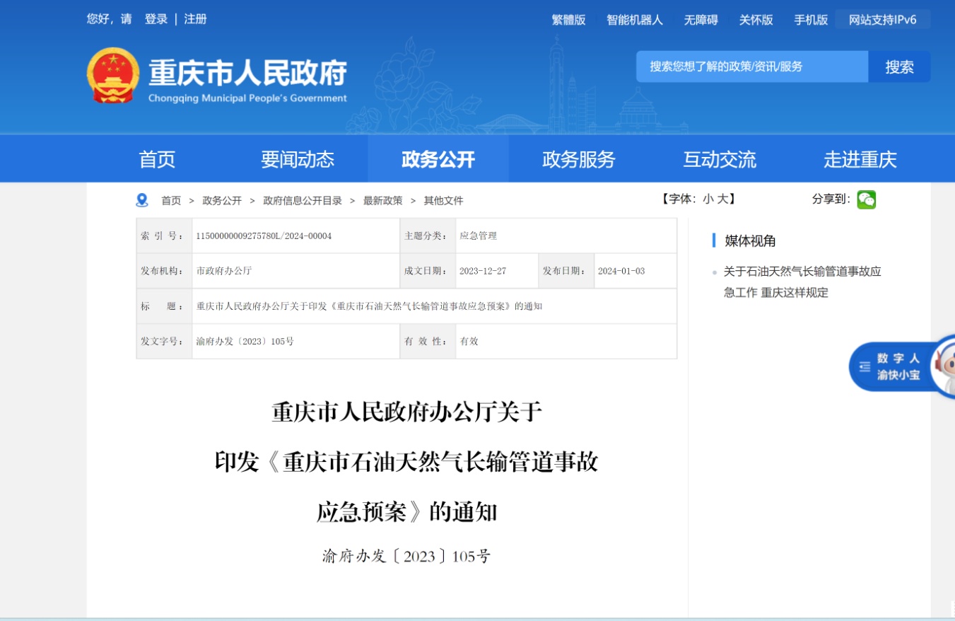 由重慶市能源局牽頭,我公司承接編制的《重慶市石油天然氣長輸管道事故應(yīng)急預(yù)案》已經(jīng)重慶市人民政府同意正式發(fā)布實施。
