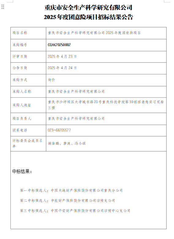 重慶市安全生產(chǎn)科學(xué)研究有限公司2025年度團(tuán)意險(xiǎn)項(xiàng)目招標(biāo)結(jié)果公告