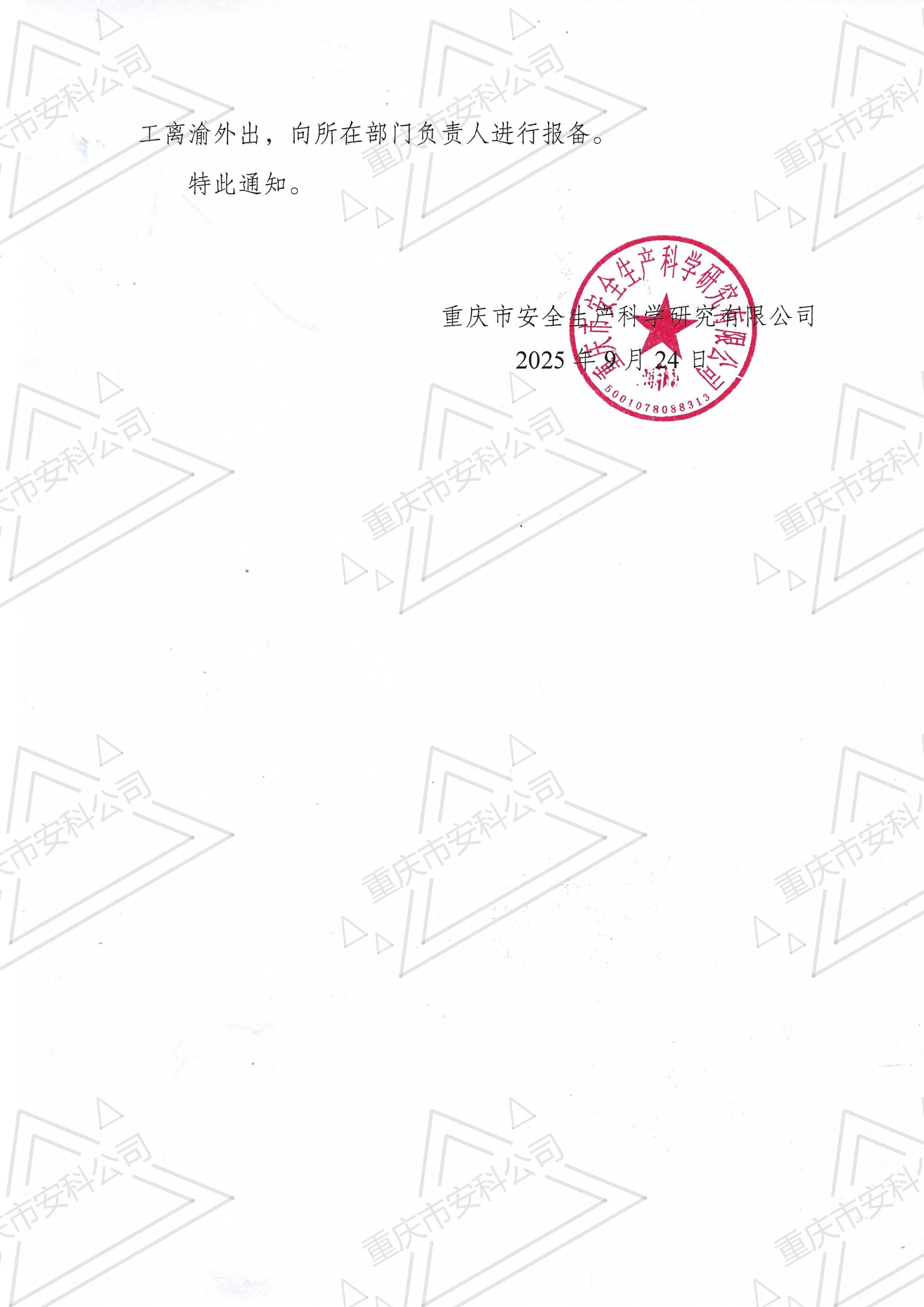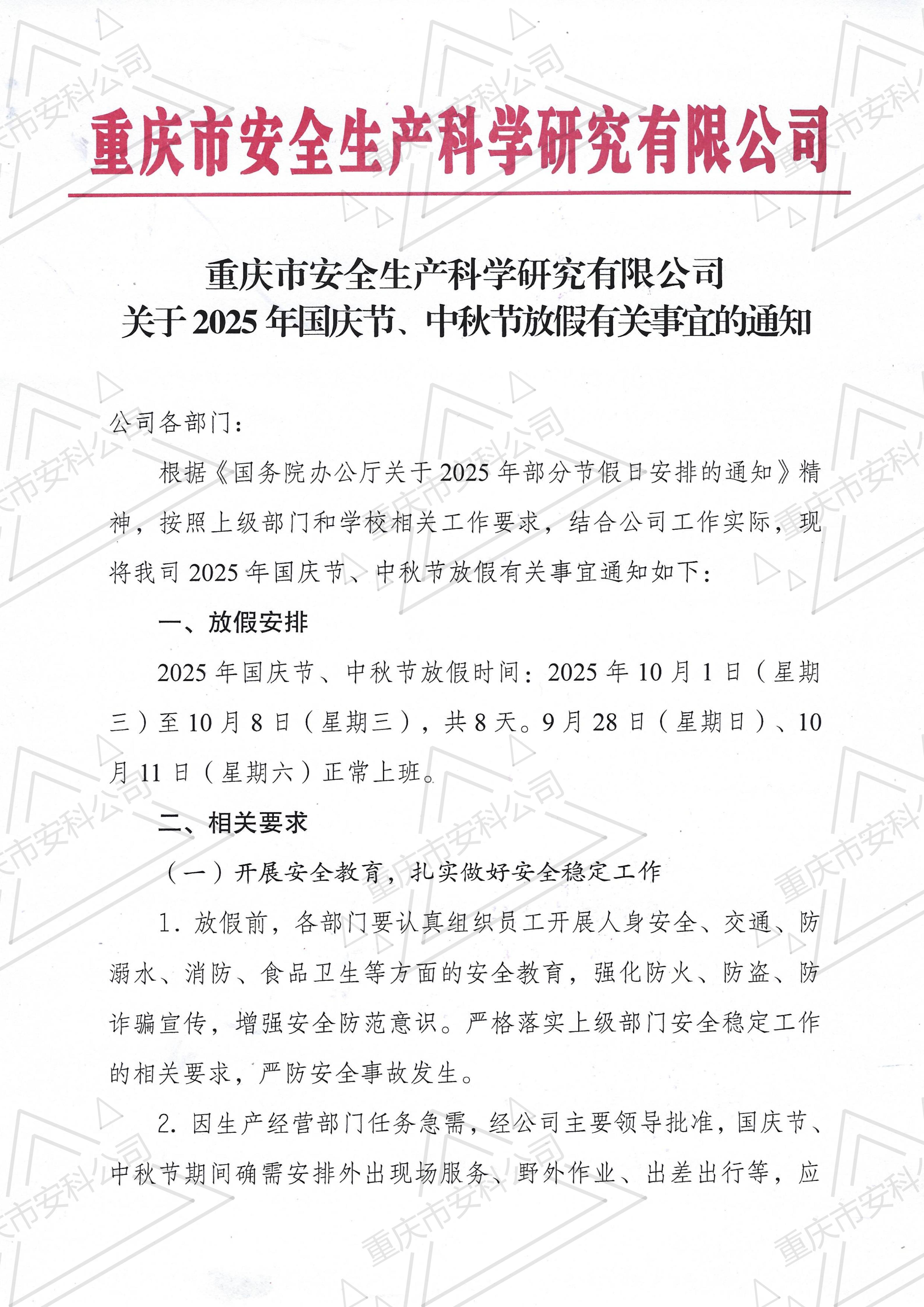 重慶市安全生產(chǎn)科學(xué)研究有限公司關(guān)于2025年國(guó)慶節(jié)、中秋節(jié)放假有關(guān)事宜的通知